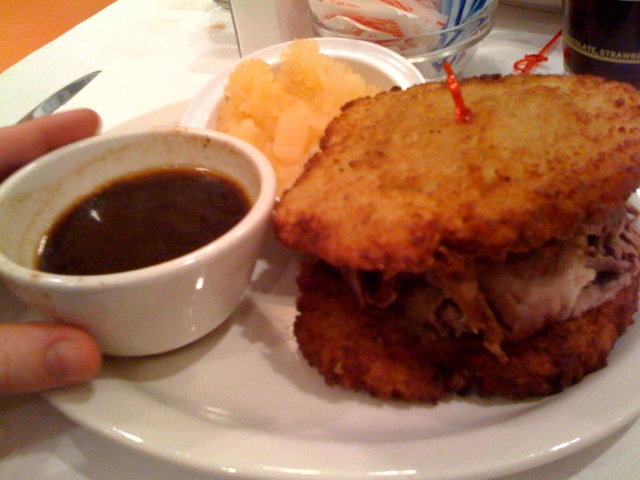 The “Something Different” consists of two oversize potato latkes encasing a pile of beef brisket, served with both au jus and apple sauce, for the messiest dipping experience of your life. It’s glorious.