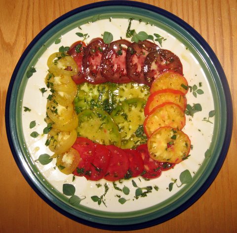 So I started off last week by lambasting the onset of Fall. But now that we had a gross little Indian Summer humid wave this weekend, I’ve decided I’m done with this whole summer thing after all. That and I remembered Fall has its own charms, especially as it relates to food. As we swing into ripe veggie season, ES reader MonkeyBoy sends these beautiful shots of heirloom tomatoes fresh from the garden. Check out those hot black/purple ones!