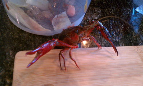 Aha! I saw boxes of live crawfish all over the sidewalks in front of restaurants in Louisiana, but I didn’t realize I could find them in Asian seafood markets in south Seattle. Excellent. We grabbed a bag full of these bad boys (with our bare hands, which was quite the exhilarating experience), along with about a pound of jumbo whole shrimp and we were ready to begin.