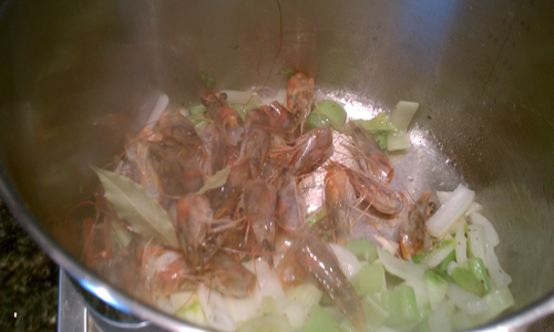 Now comes the fun part: beheading and peeling your shrimp. Eric swears that the heads and shells/tails must be separated, because the heads will provide a great flavor, and the tails get too strong and make your stock taste like “old canned fish” if you don’t remove them before the stock is finished. I just took his word on that one. We heated up our pot with the heads and vegetables in it.