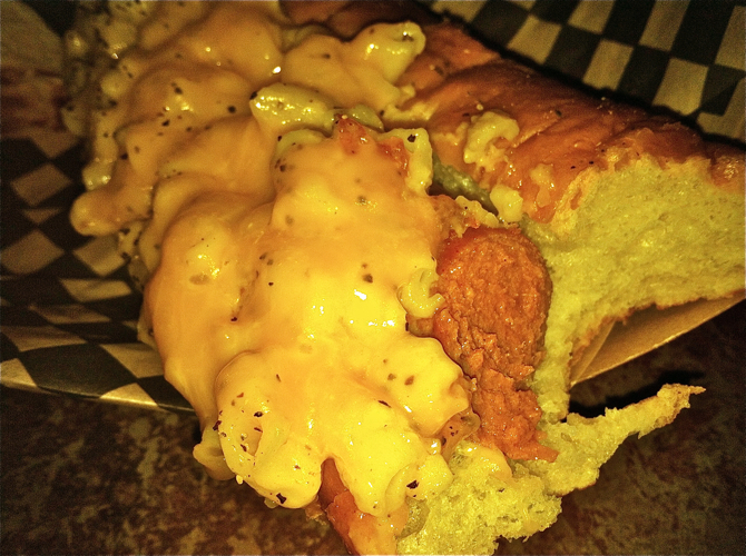 We’ve covered the existence of macaroni & cheese hot dogs before on ES, but I’d never seen them in the wild… until now. During one of my many bar-hopping benders last week, I cruised into Po Dogs in Seattle for a late-night meat fix, and discovered the accurately named Mac ‘n’ Cheese Dog: Homemade macaroni and cheese topped with Tillamook cheddar cheese. As a professional food writer, I advise you to order barbecue sauce on this as well.