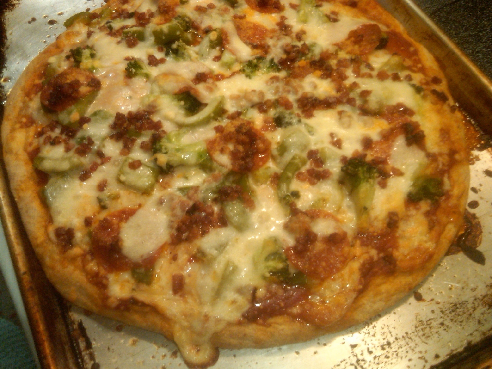 Last night, my girlfriend and I tried it out. I figured it would be cheese, broccoli, green peppers, and pepperoni, with a beer-spiked sauce. Then my wonderful girlfriend picked up a package of pancetta to add in to the mix. To balance that out, we went healthy with a whole wheat crust.