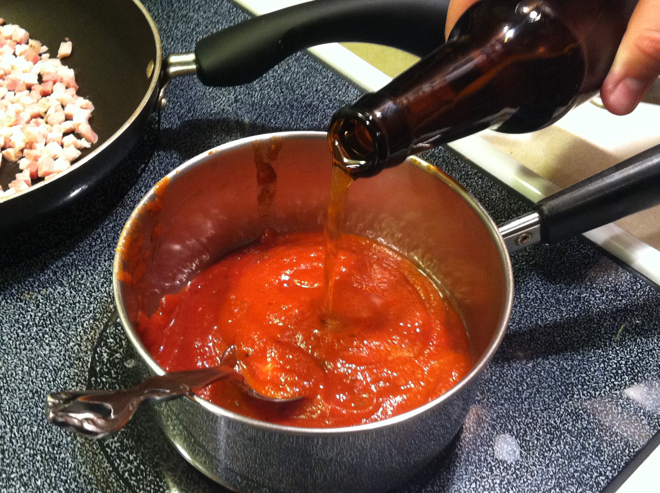 While sauce is heating, put the pancetta in another pan and turn the heat on to medium. Then, pour ¼ cup of your beer into the pan with the pancetta in it.