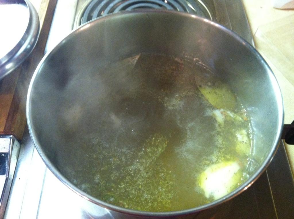 First, add the chicken broth, then fill the can with water and add that to the saucepan. Then, add 2/3 -3/4 cup of beer, according your your liking. Add your seasonings, two smashed cloves of garlic and the 2 bay leaves and bring to a boil. Once the beer broth is boiling and tastes to your liking, put in the chicken, take the liquid down to a simmer and cover for ten minutes. You can even take the pot off the burner — just check on the chicken and you may need to bring the heat up again. Then, shred the chicken!
