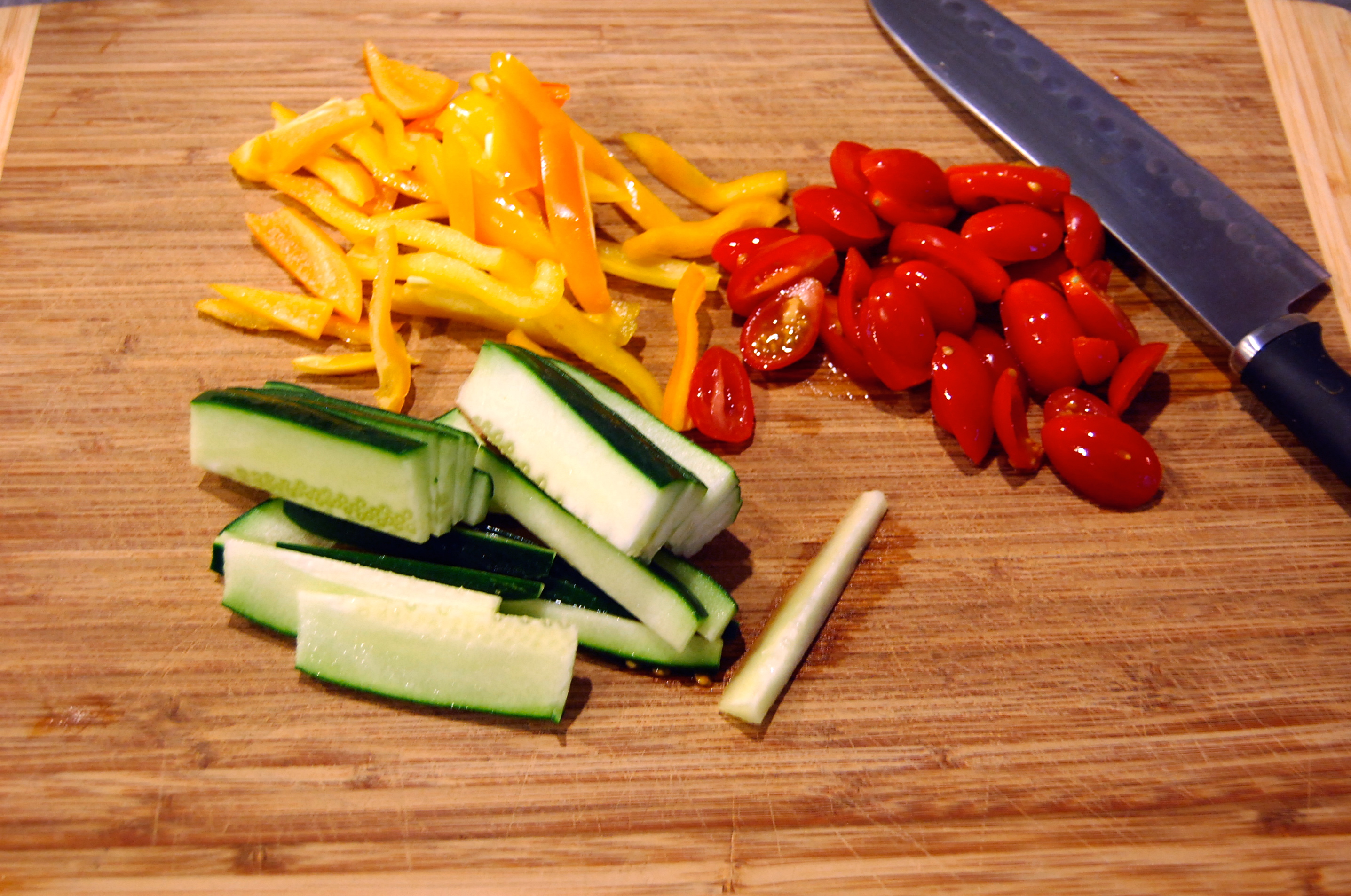 We begin our journey with the creation of “slaw”—slices of sweet bell peppers, grape tomatoes, and cucumber—marinate the trinity in rice vinegar, garlic,and ginger. (Oh yeah, measurements are important: 1/4 cup rice vinegar, 3 cloves minced garlic, 2 tbsp ginger.)