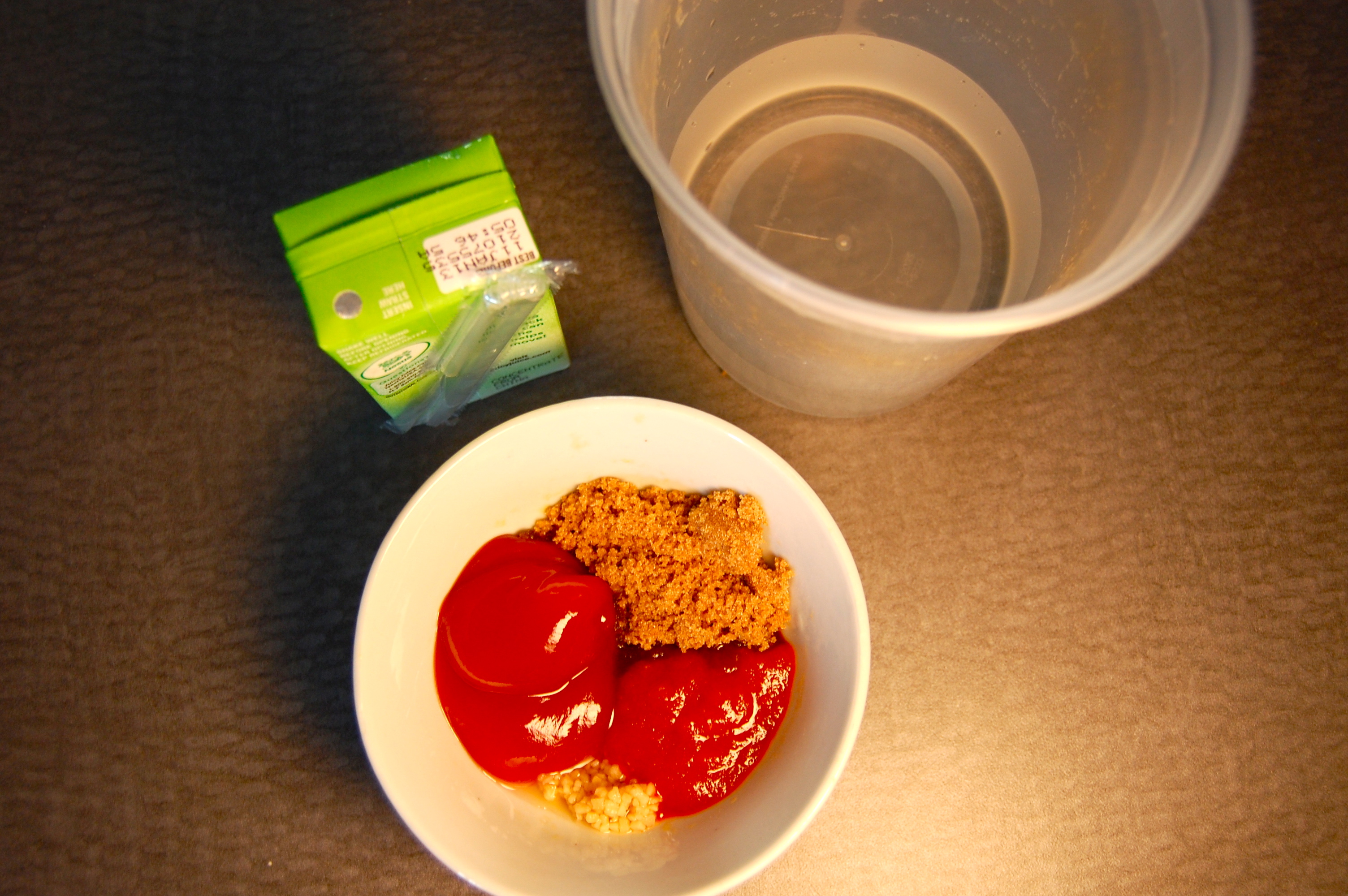 While the rice boils away, assemble the barbecue sauce, consisting of: