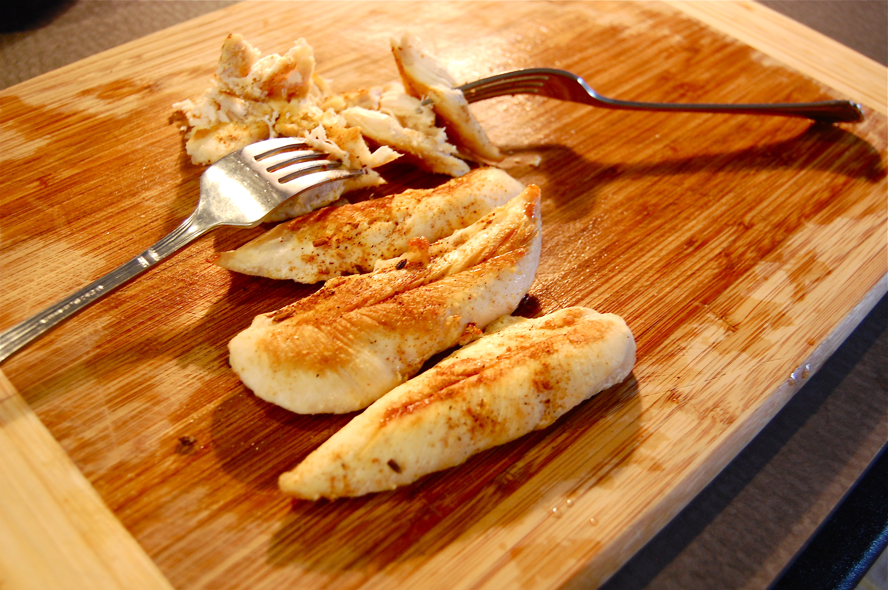 Brown chicken tenderloins with blackened seasoning; shred chicken with a fork.