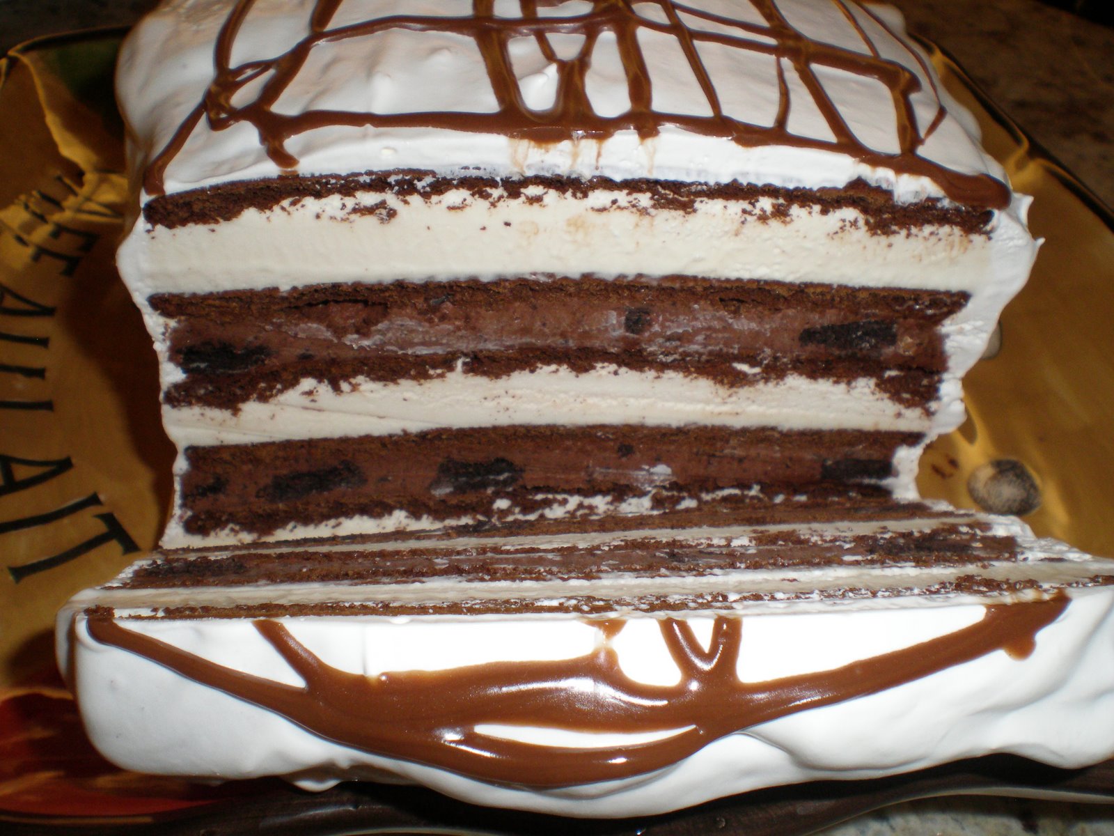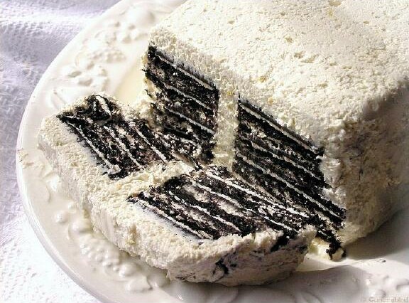 Ice cream sandwiches, Oreos, chocolate pudding, Cool Whip, fudge. I think the fact that ice cream sandwiches were used is pretty interesting. And allows for the opportunity to make your own homemade ice cream sandwiches to stuff between pudding, Oreos, Cool Whip, and fudge. I have a personal vendetta against Cool Whip, so homemade whipped cream (with crushed Oreos?) would be called for in my version.