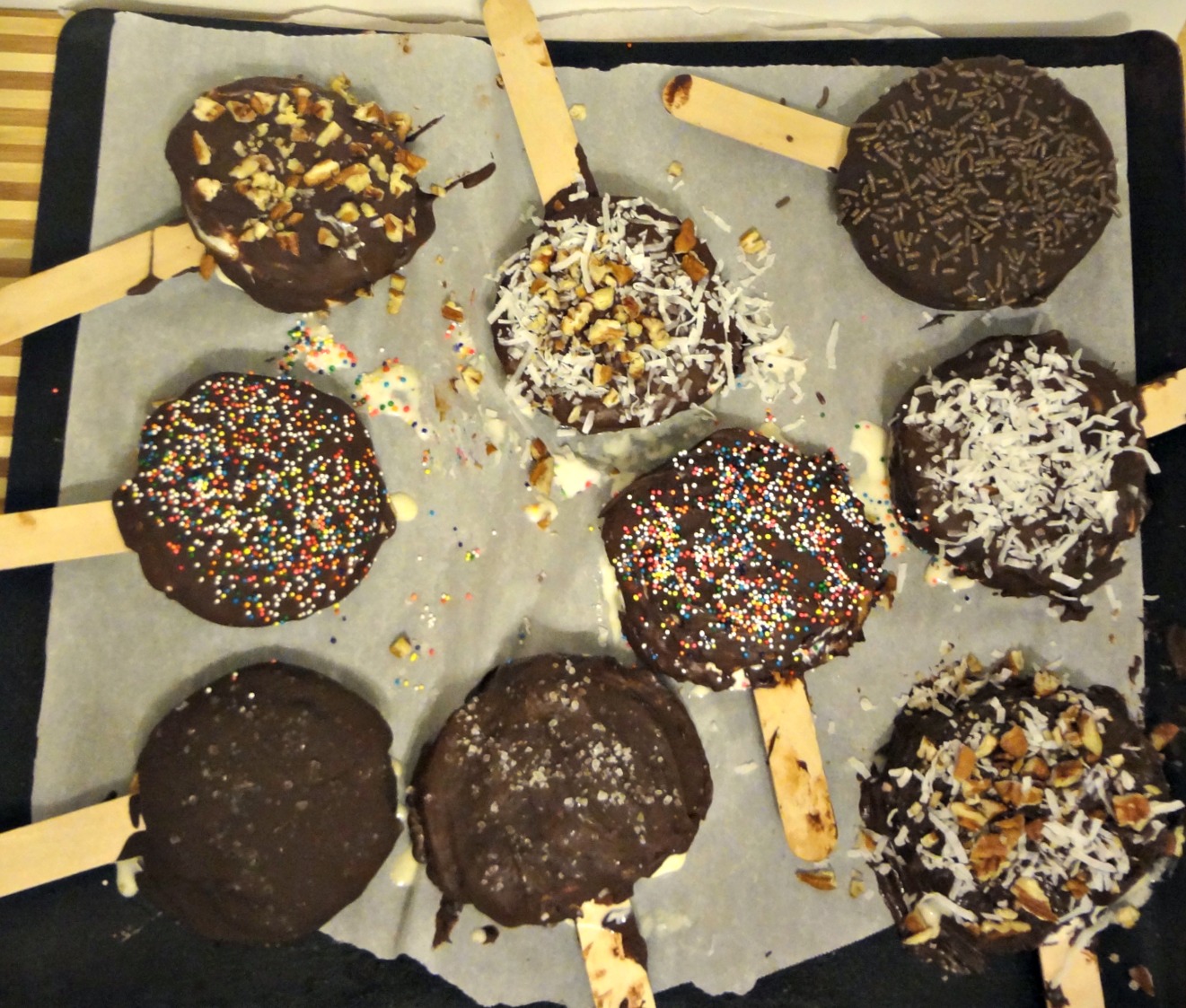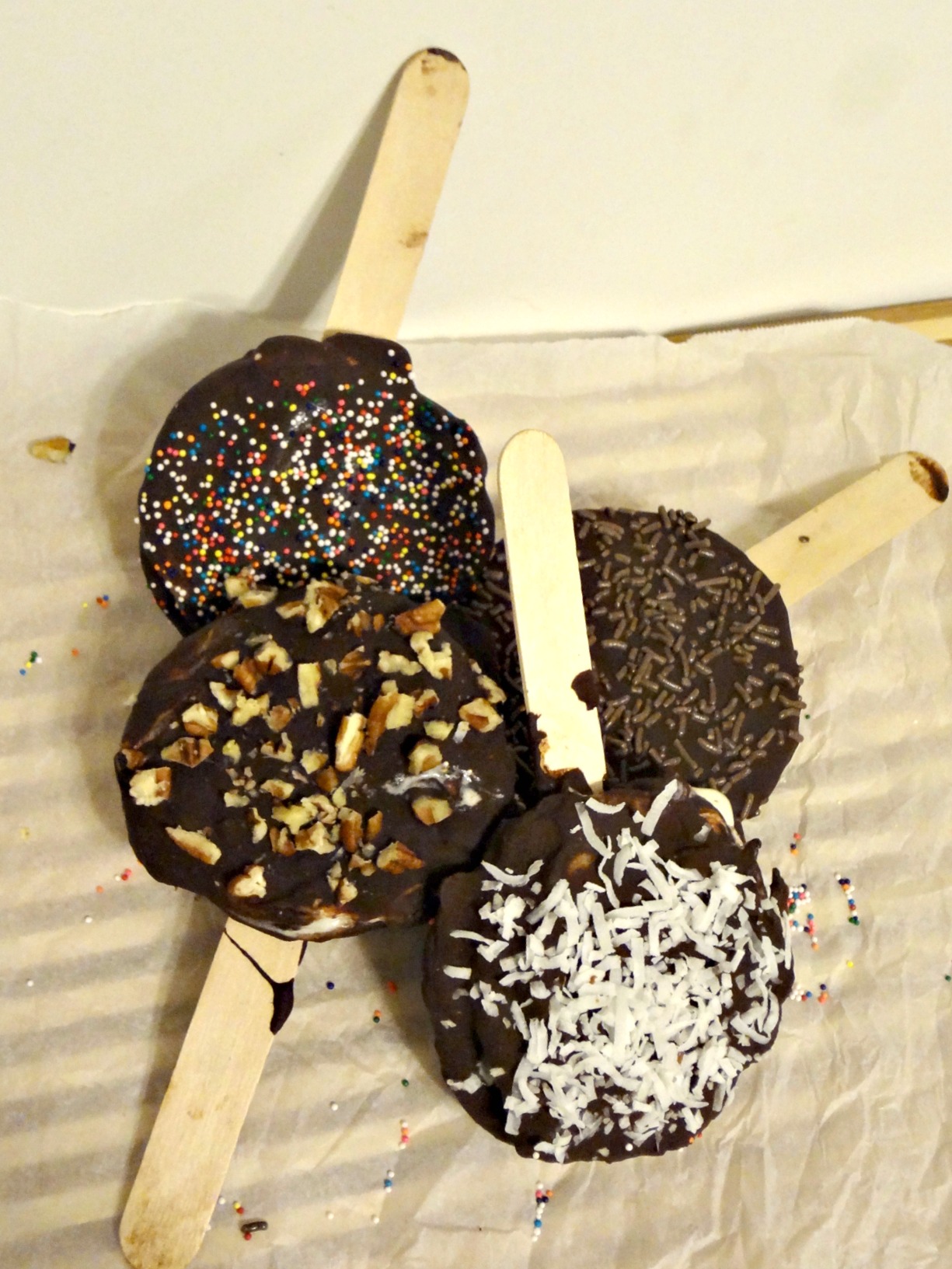 Immediately after dipping, add toppings like nuts, coconut, sprinkles or sea salt.