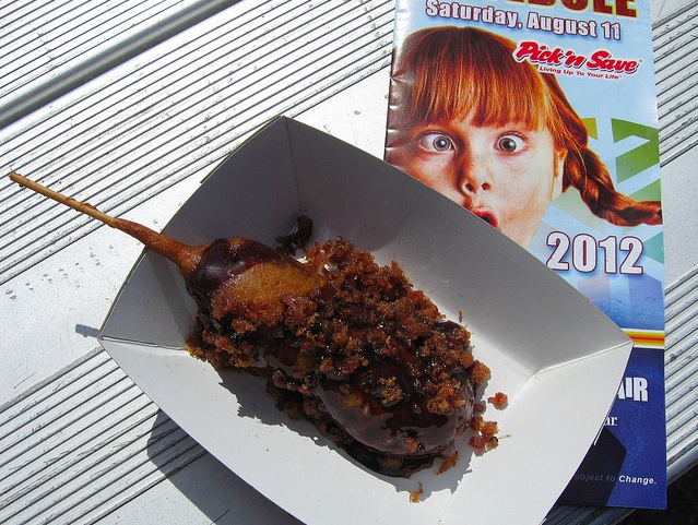 Well, in regards to ridiculous overloads of novelty foods, it’s all downhill from here—state fair season is over for the year. We’ll have to wait for months before a stream of deep-fried, chocolate-covered, bacon-wrapped indulgences can once again make their appearance in our diets. In the meantime, let’s take a look at some of the most shocking new creations that made their debut onto the state fair food scene in 2012. Steel your arteries…
