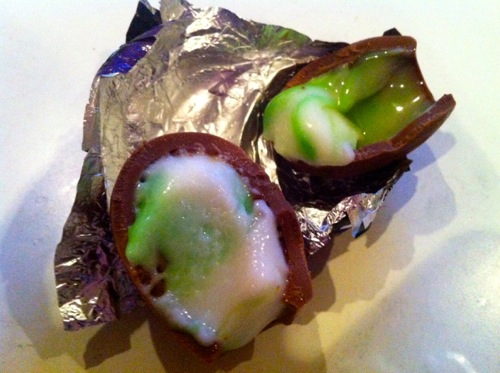 There’s not much to say about these Screme Eggs that hasn’t been said about the traditional Creme Egg. If you like smooth milk chocolate filled with runny frosting, you’re not gonna be disappointed. The notable difference, of course, is that the “yolk” of the egg is bright, oozy green instead of the traditional orange. I think it tastes exactly the same; one of my friends commented that the green frosting tastes like lime, but I think her eyes just tricked her. Weirdly, the website calls it a “caramel center,” but I think we can all agree that it’s classic frosting.
