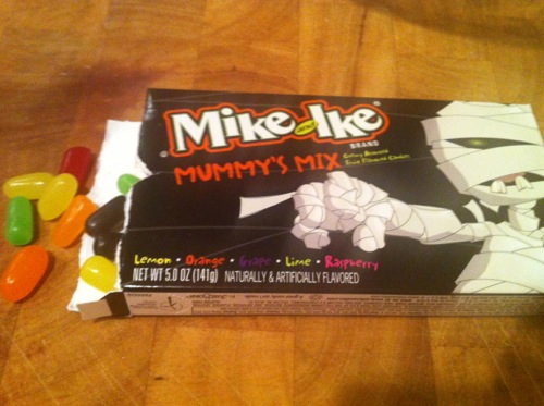 Next up: the Mike & Ike Mummy’s Mix! I have to say I was a little let down by these guys, and this is coming from a person who generally likes Mike & Ikes. I guess I was just hoping for something more. What makes them spooky? What makes them mixed by a mummy? All of this is very unclear. The pellets aren’t orange and black, they aren’t spooky flavored…just your average lime, lemon, orange, raspberry and grape. I guess grape is purple, and purple is kind of like black, therefore this is Halloween-y?