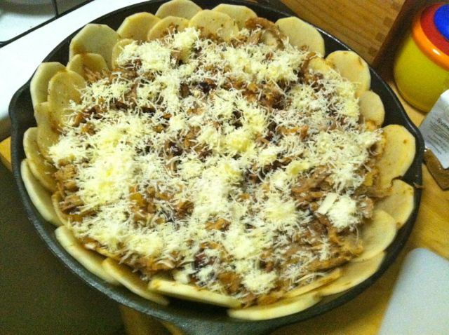 Grate some provolone (we mixed with cheddar) on top. We also added some scallions. Jalapenos wouldn’t have been bad here either.