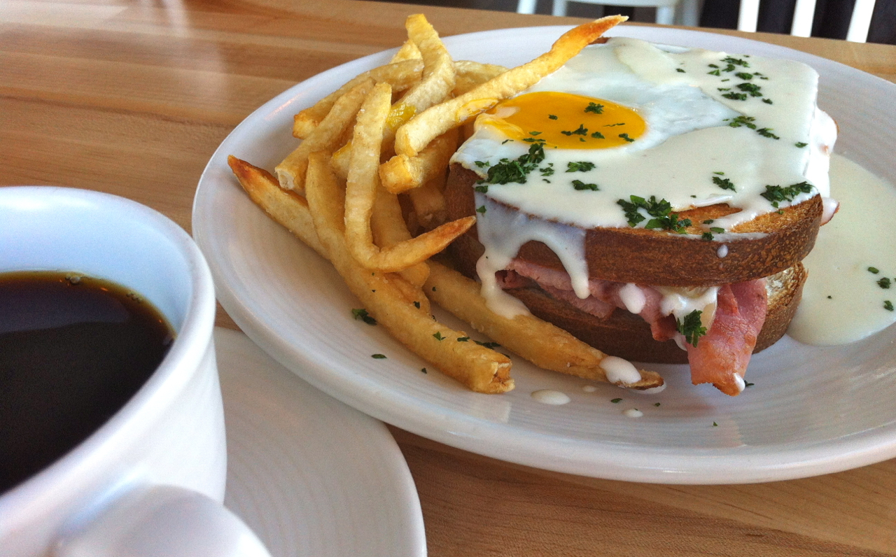 A perfect Croque Madame sandwich smothered in creamy mornay sauce and topped with a rich, runny egg. With frites and black coffee on the side, of course. Go big or go home. Or as the French would say, I guess, rentrer à la maison ou grand feu?