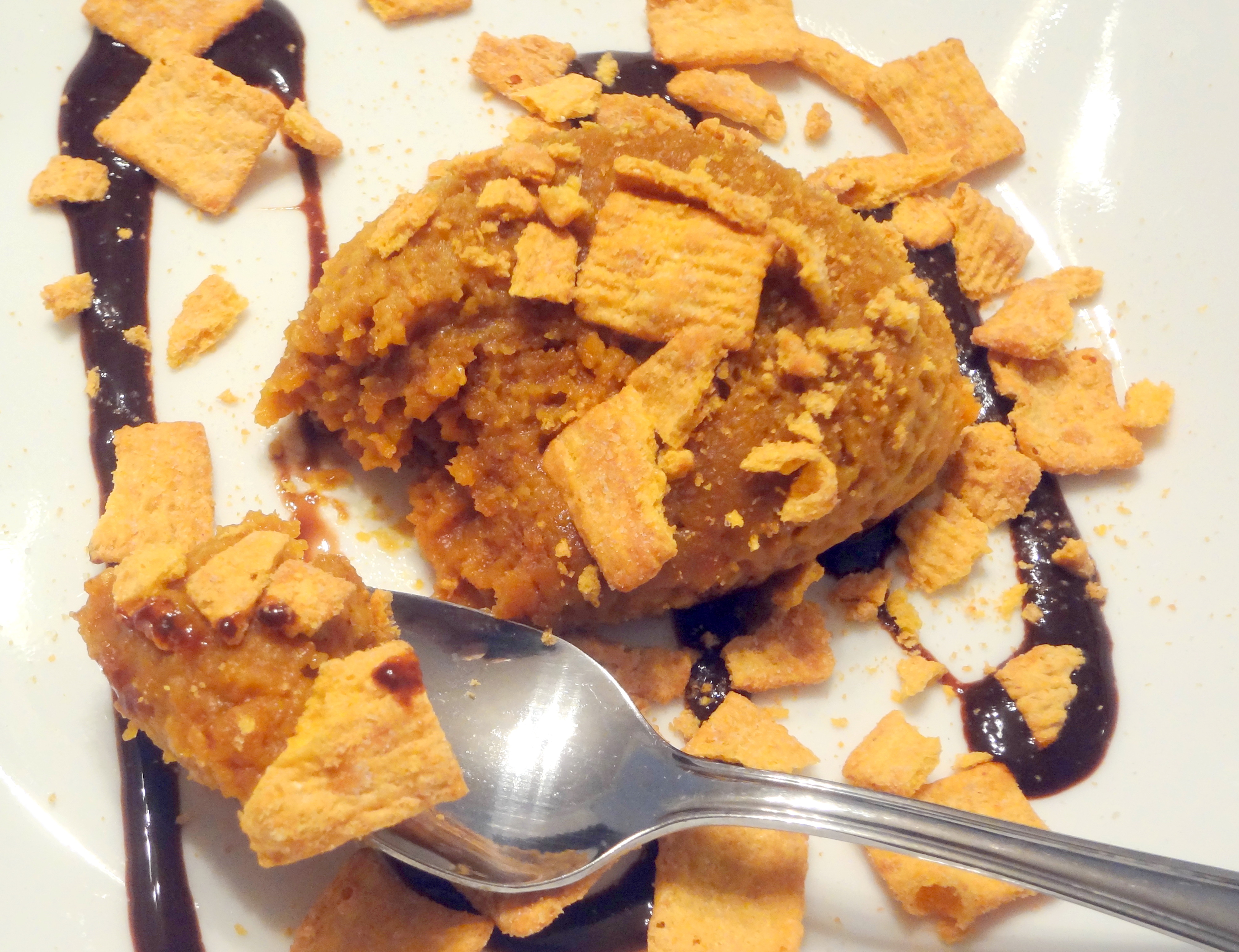 Mix all this together. Spray a microwavable coffee mug or ramekin with non-stick cooking spray and pour the mixture in there. Microwave for 55-65 seconds. Let it cool as long as you can before losing patience. Dump in on a plate with a drizzle of light chocolate syrup and additional cereal for topping. Or eat it straight from the mug. You are the boss of you.