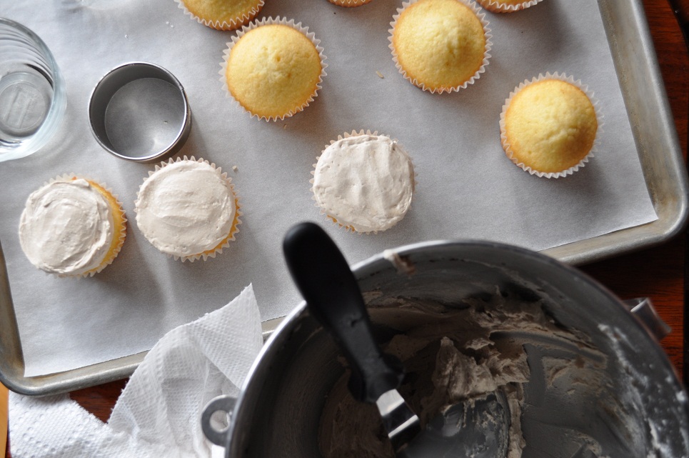 - Lightly rub some oil on the inside of a circle cutter. Place on the top of a cooled cupcake.
