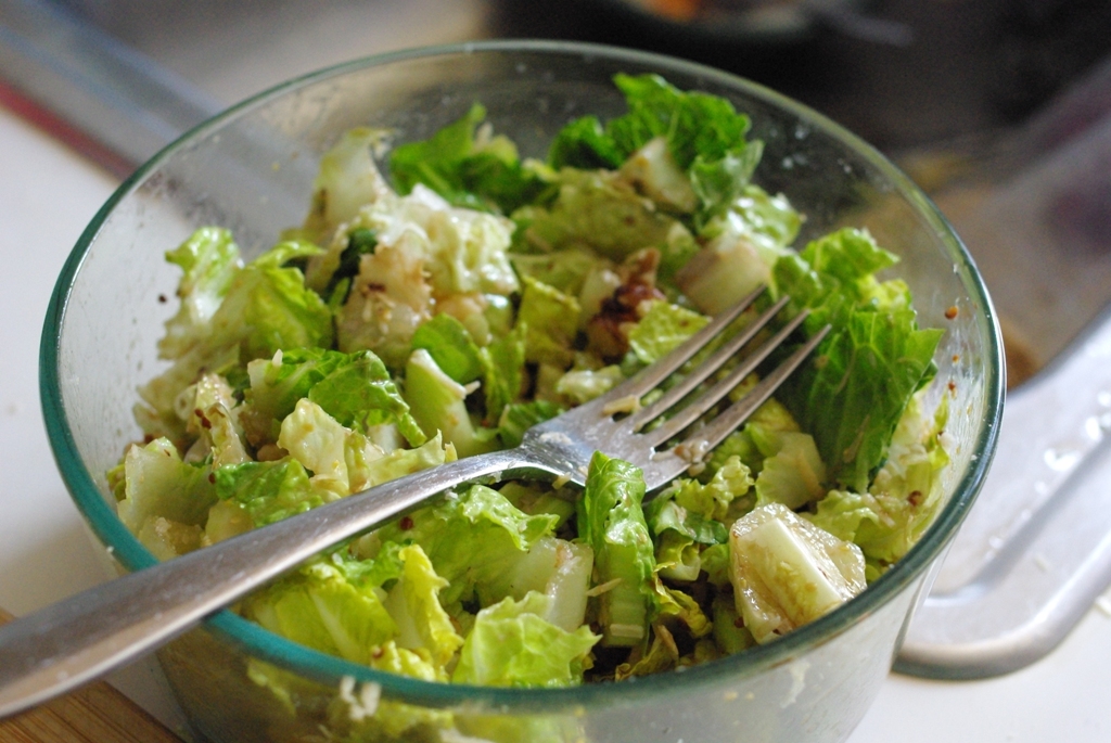 Lately, we have had a lot of visitors and dinner guests around this house, none of whom can ever bear to come empty handed. The wine gets drunk, the cheese dip gets, well, dipped, but there are unsurprisingly a few items that linger after company has departed. It’s been a week since I tripped to the grocery, so today when I rifled the fridge for lunch, the produce pickings were slim, save a bag of celery and a heart of Romaine lettuce. These are both foods about which I feel totally neutral, which I think is also an accurate description of their nutritional value, and would never have purchased on my own, but thanks to our many visitors, there they were.