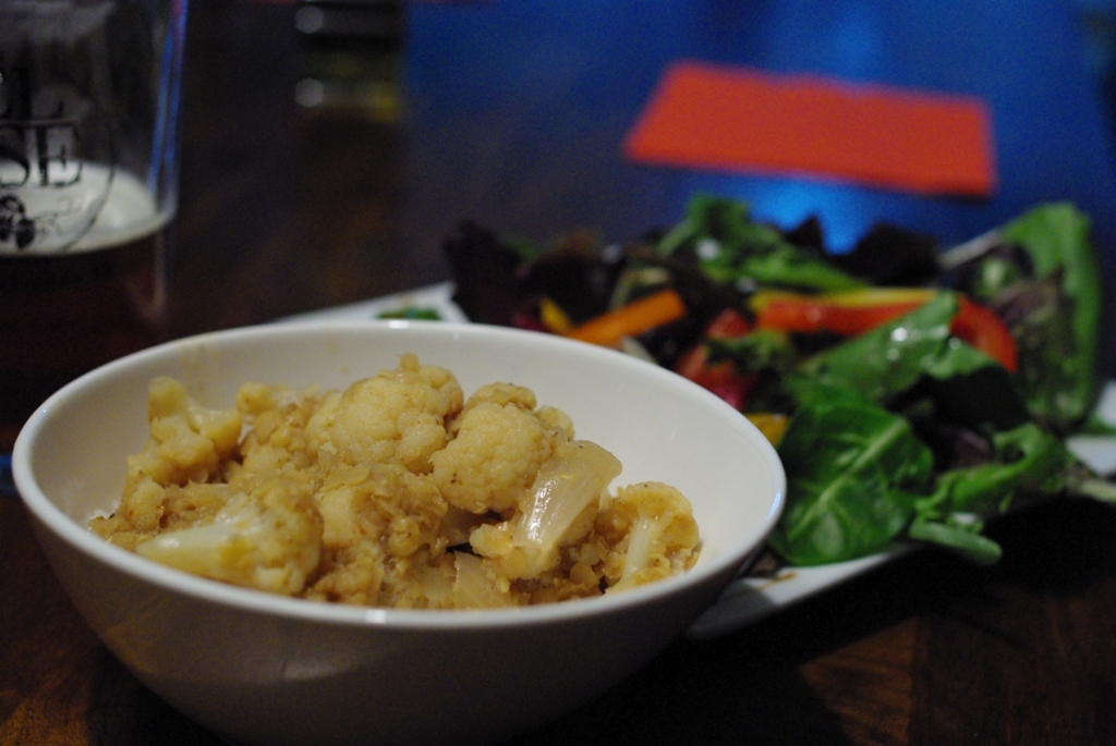 This story has happy ending, though. In the following weeks, I looked for any opportunity to make my new favorite dish for others. Fortunately, not all my friends feel as negatively toward cauliflower as that BFF who shares my bed. My vegan friend Katie appreciated the animal-free heartiness. My friend Kate (yes, all my friends really have the same name) declared it delicious, spicy but not too spicy, after warning me that she probably wouldn’t like it because she doesn’t like a lot of things. It’s my new go-to for any night my darling cauliflower-hater has to work late or is otherwise indisposed at the dinner hour, and I don’t have to feel guilty for making his favorite on a night he’s not home.