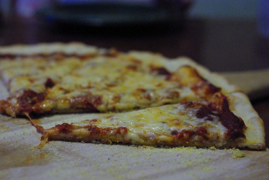 Heat oven (and pizza stones) to 450 degrees. Roll dough as thin as possible. Place on a liberally cornmeal-ed pizza paddle and top. Bake for 8-10 minutes. Makes 3 14-inch pizzas.