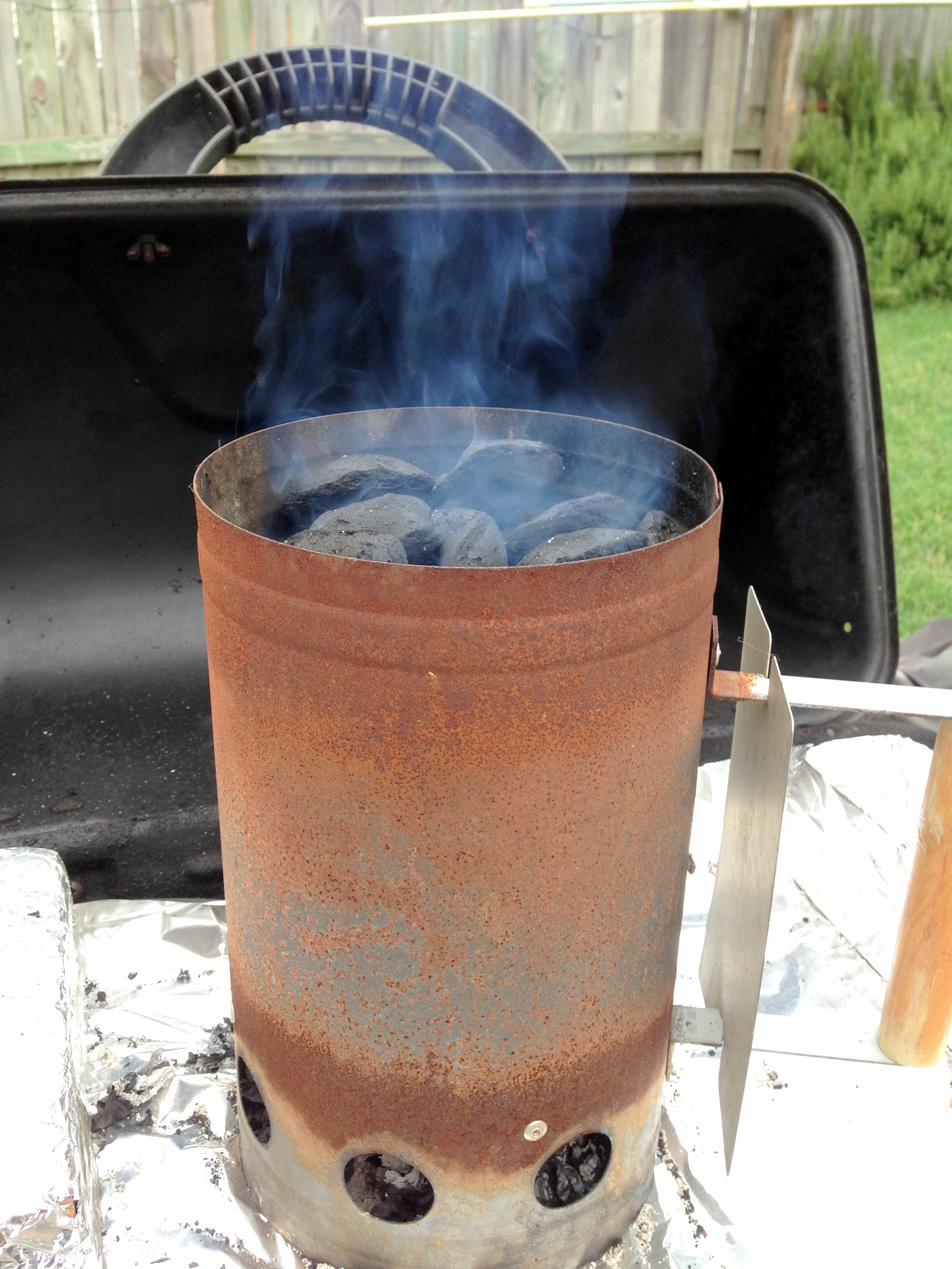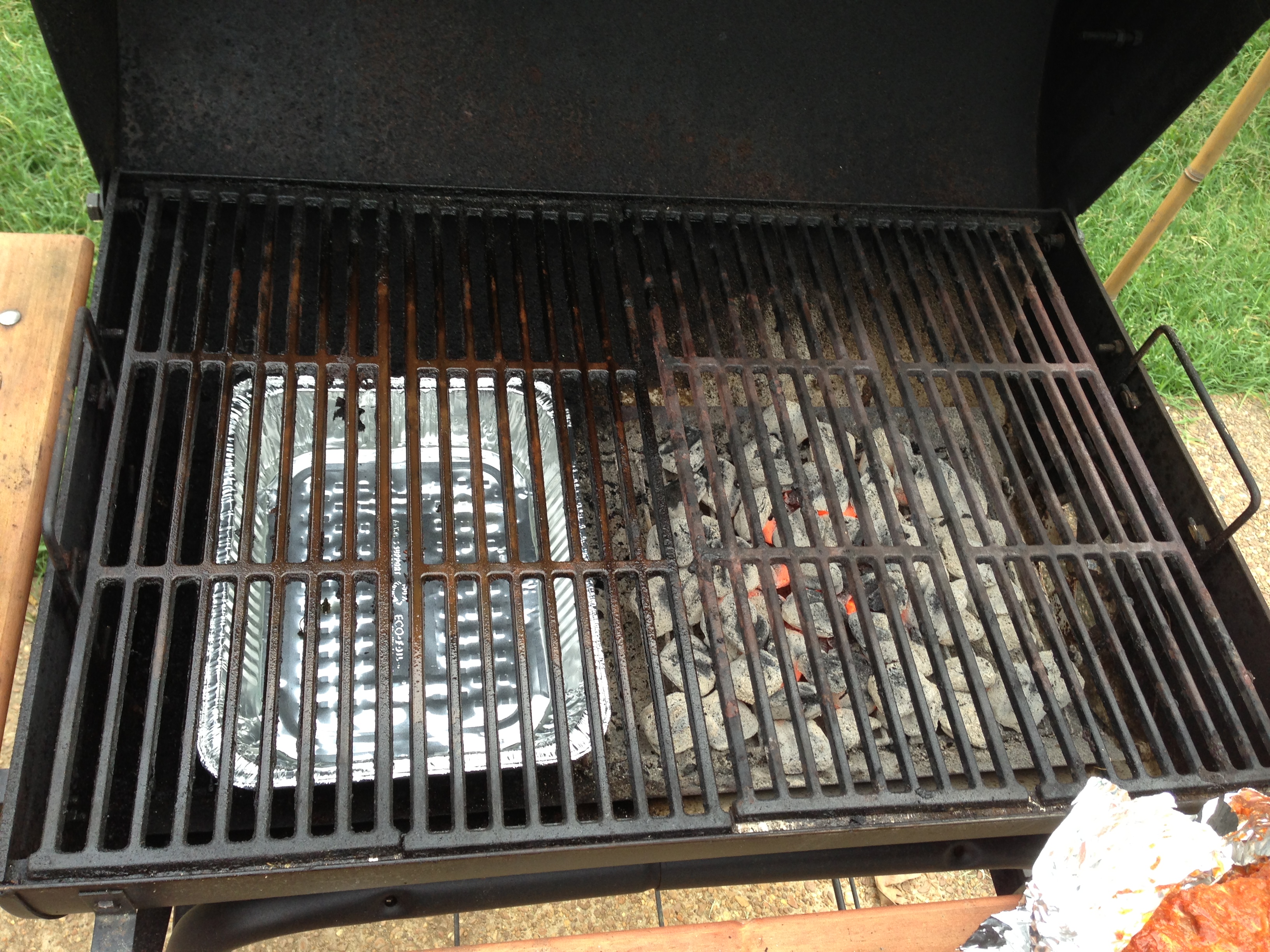 Fill a chimney starter with coals and newspaper and light it up. Get those coals smoking and then put them on one side of your grill. On the other side of your grill, you should have a drip pan filled with 2 cups of water.