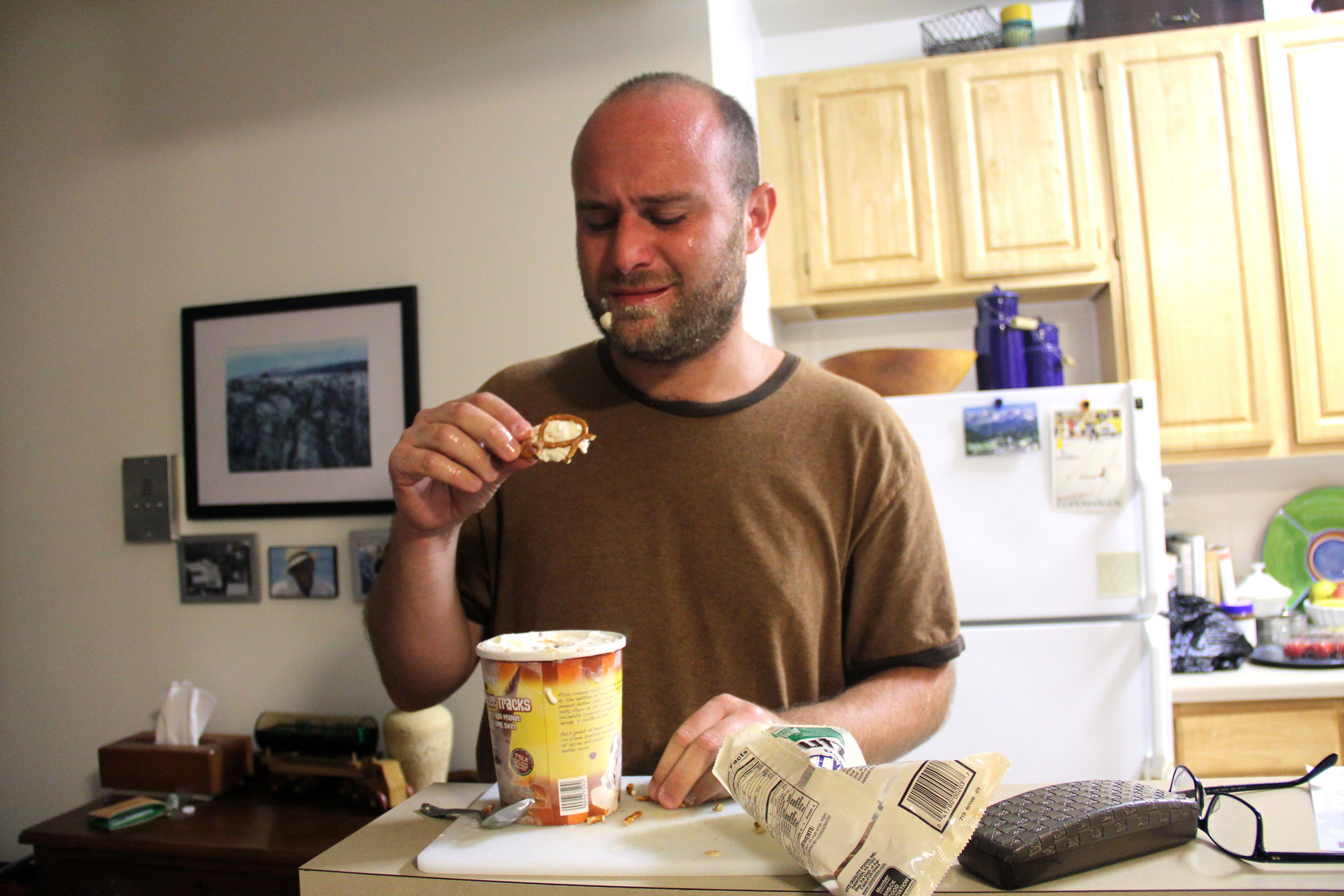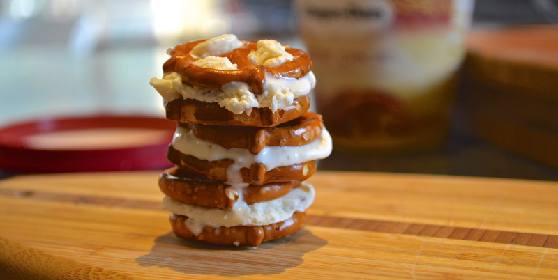 “Take pretzel. Scoop enough ice cream onto pretzel to cover it. Top with another pretzel. Eat, in one bite if possible.”