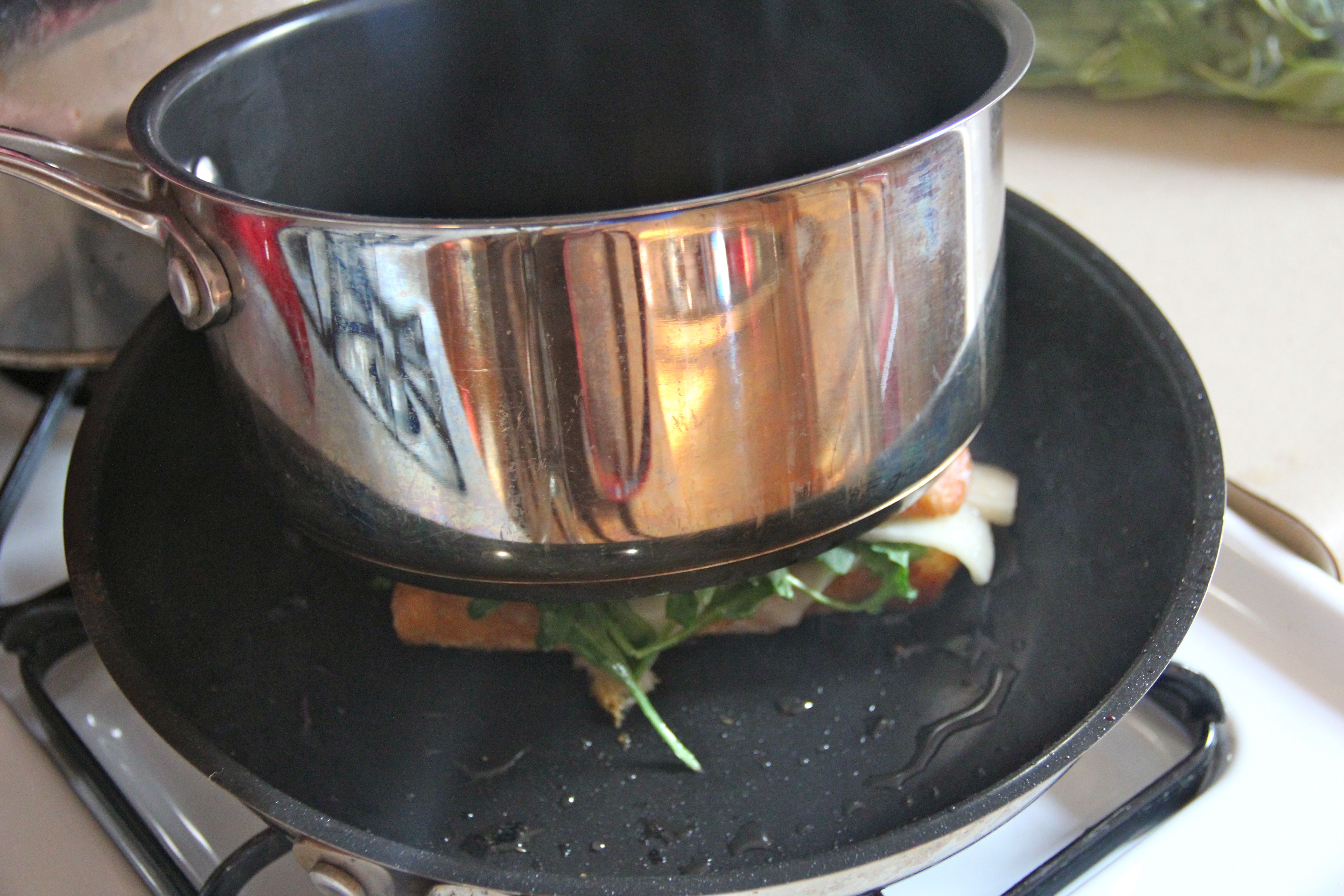 I don’t happen to have one of those fancy panini presses either, so I resorted to a patented method my family developed for making grilled cheese in a pan: crushing it down with a pot so that the cheese melts quickly, before the toast burns.