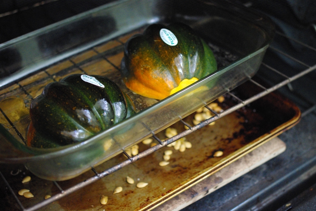 Piles of super-cheap gourds at the grocery, a morning chill in the air, and some delicious looking round-up posts can only mean one thing: squash season is upon us. While my husband is partial to butternut (particularly as soup), I embrace all winter squash varieties, from spaghetti to acorn to pumpkin (read: not just for jack o’lanterns, eaters). Reading Snebbu’s post about ways to use butternut squash the other day got me thinking, though…squash is not always the easiest to cook with. It requires more time and advanced planning than my other go-to produce items of the season, apples. So I thought I’d share my tried and true squash preparation method, and then see if you all had any suggestions to add.