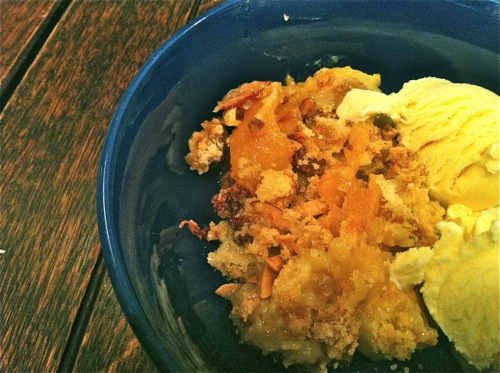 Have you ever heard of “dump cake?” Kind of a gross-sounding name, I know. My mom used to make it for us when we were younger. It’s a very easy, quick, and delicious dessert comprised solely of peach pie filling, cherry pie filling, and yellow cake mix. After dumping those in a cake pan and baking, it kind of comes out as a cross between an actual cake, a cobbler and a pie. Anyway, this summer I got to thinking about my mom’s dump cakes and decided I wanted to bust out my grownup version of the old favorite. It still uses some of the “cheater” ingredients—canned pie filling and cake mix—but I changed up some of the flavors (coconut instead of cherry) and added a few more interesting elements to the topping (toasted coconut-almond crunch versus just cake).