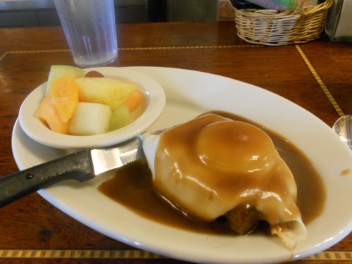 MEATLOAF eggs benedict. Country biscuit topped with sage meatloaf, a large poached egg, and tons of rich brown gravy. Please note that this is a half order. I figured the full-size dish would kill me. Not only was this crazy enough that I had to order the dish, it was also delicious. The meatloaf was moist (ugh, I hate that word), fragrant and flavorful, very herby, and not greasy. As for the biscuit, it was the perfect combination of sturdy — it could hold its own against the heavy egg and abundance of gravy — but at the same time, light and crumbly.