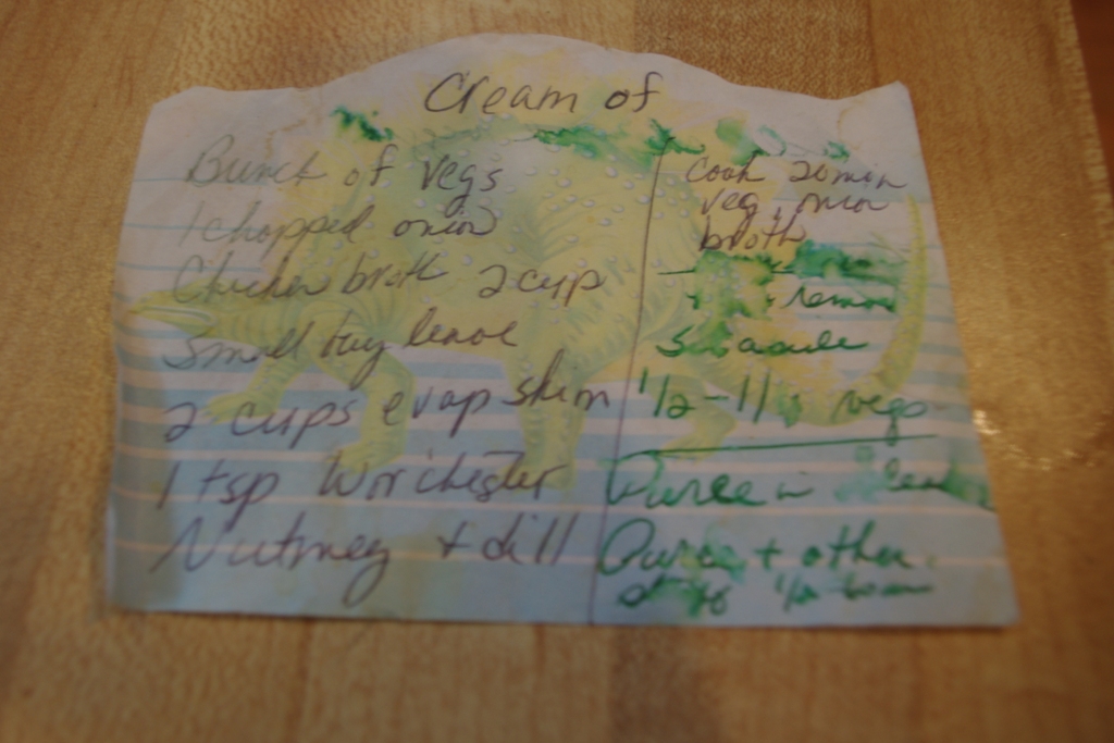 Nature has given me a few cold and rainy days these past few weeks, and I have taken full advantage. My go-to soup recipe is, like most of my recipes, not really a recipe at all. Don’t blame me, though. As you can see by the ancient sticky note below, this one has been handed down to me from my mom.