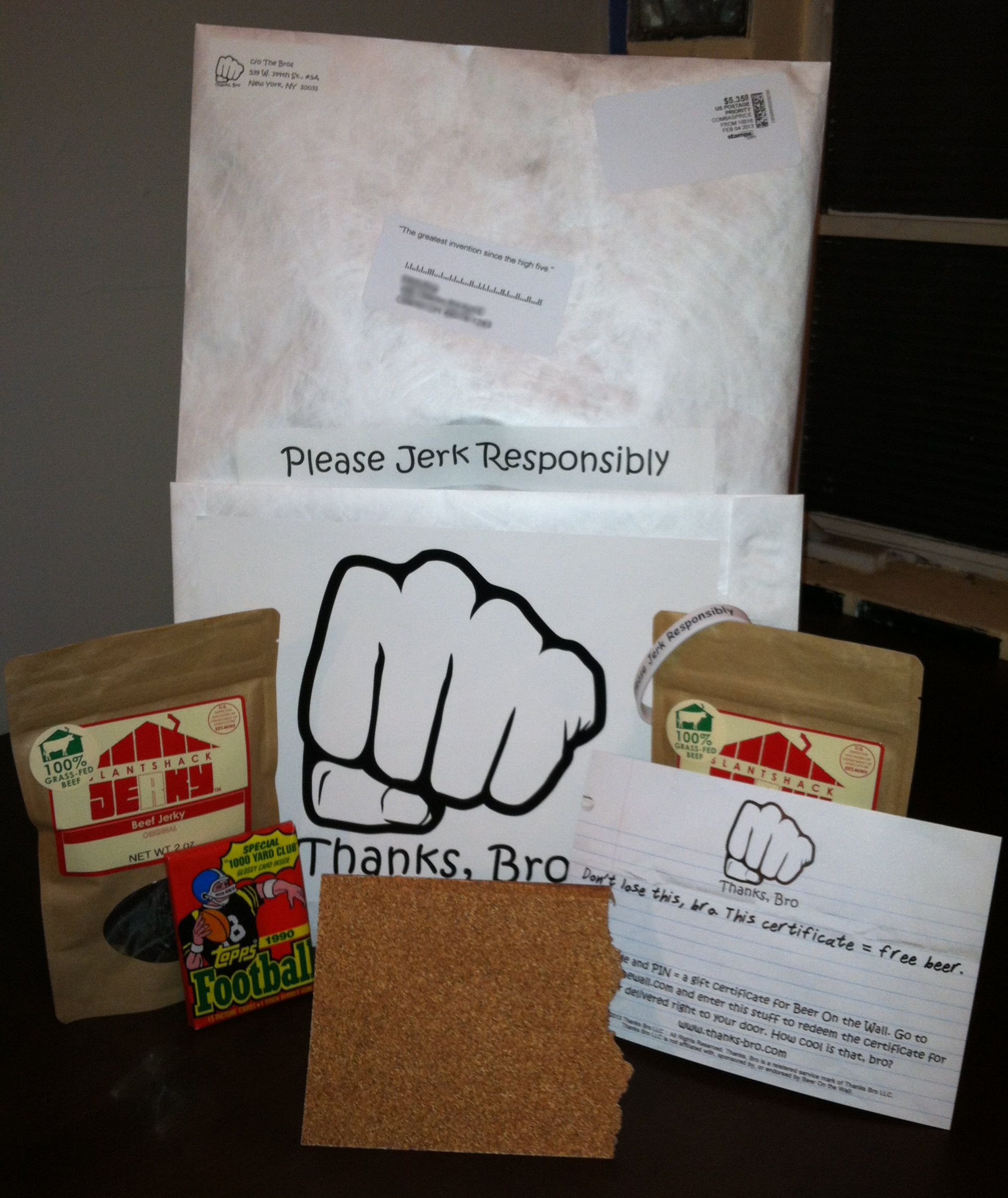 As gender non-normative as we like to be here at ES, let’s face it: you just can’t send a guy friend a fruit basket. (Aside: this is not true. If anyone wants to send me a fruit basket, I’ll gladly accept. But still.) Enter: Thanks, Bro. The New York-based service, which just went nationwide, allows you to send a thank you gift to a friend consisting of just two things: beer and beef jerky. Your bro gets to pick out what kind of thank-you beer he wants, and with the jerky you can either go the high-quality route, sending SlantShack’s Wild Rubdown Jerky, a grassfed North Dakota beef option encased in cayenne and brown sugar, which really brings out the delicate earthy tones of the—DAMNIT I couldn’t stay bro-y even for a minute!—or you can go with the “Fuck You, Bro” package, opting to send a single Slim Jim and s six-pack.