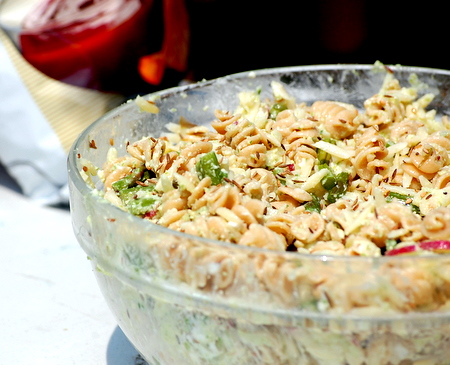 At first I panicked when I saw only a 1/4 of a box left of the whole wheat squiggle pasta. How could I complete a proper salad for a birthday party with only a 1/4 box of pasta?! But then I spied some orzo. Who said pasta salad must only carry one type of pasta?