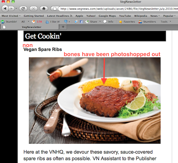 To illustrate its recipe for vegan spare ribs, the magazine apparently used stock photography of the real meat kind of spare rib, then scrubbed out the bones to make it look faux.