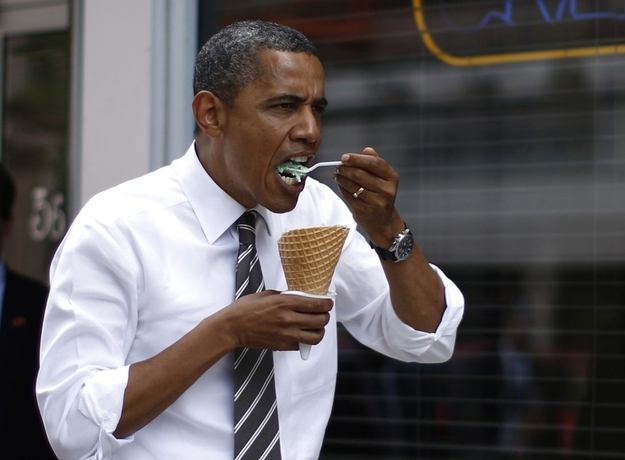 Romney goes for a tall cone o’ soft serve, which is one of my favorite treats. (Seriously, every time we drive by a Dairy Queen on a road trip, I scream “DQ!!!” like a rabid six year old.) Obama, on the other hand, goes for a controversial choice: mint chocolate chip eaten with a spoon. I’m not kidding about the controversy; bloggers had a heyday about Obama’s outrageous rebellion. (“If he wanted to eat with a spoon, he should have ordered ice cream in a cup!”) Well, guess what, haters: I also eat ice cream out of cones with a spoon. Sometimes my teeth are sensitive! I’m glad to see our sweet-toothed POTUS understands my struggles.