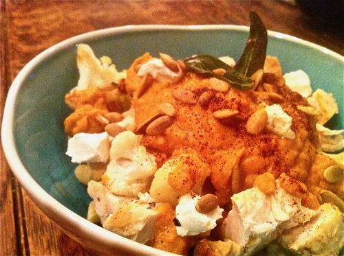 Roasted Cauliflower-Pumpkin Pasta with Goat Cheese, Pepitas, and Sage