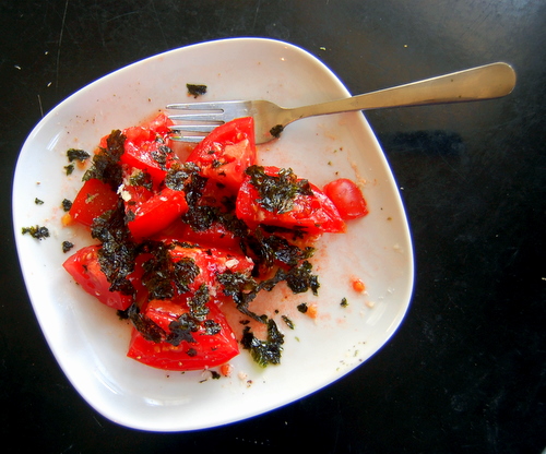 Savoring these tomatoes came easy: a simple salad. But I ditched the normal Italian-seasoning of mozzarella, oil and balsamic vinegar and traveled a little East. Topping the bright red hunks is not basil, but seaweed. I crumbled Green Chopsticks‘ Roasted Seaweed Crisps over top for a slight taste of the sea and a definitive crunch. With chunky Maldon sea salt and a few grinds of pepper, this salad found all it needed.
