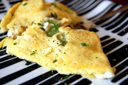 I whipped together egg, Dijon mustard and a splash of water. I let that set, then laid in slices of tomato, crumbles of goat cheese and lemon thyme. I must not have started with enough butter (or my Beka’s non-stick coat is already fading) because I couldn’t slip the egg off without it cracking, so I flipped it on itself instead, ending with salt, pepper and more thyme.