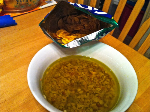 Taste and adjust salt, pepper, and lime as necessary. Pour into a bowl. Serve with delicious plantain chips, which you can find in the “ethnic food” section of most grocery stores, or maybe also in the chip aisle, and of course at any Hispanic market.