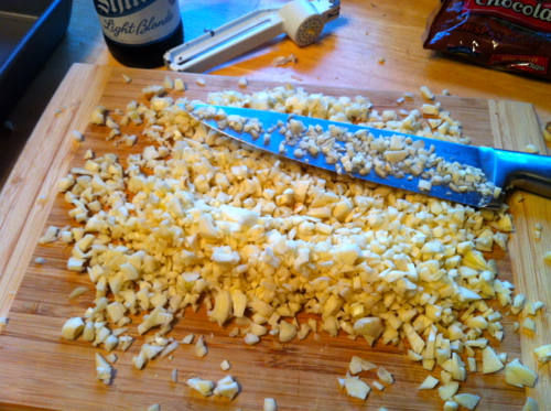 See that garlic press sitting in the background? Forget about it. Useless. Just chop forever with your knife.
