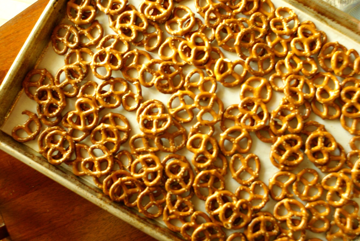 - Preheat the oven to 400F. Spread the 5 cups mini pretzels over a parchment-lined baking sheet. Toast for 7 minutes, until dark brown and aromatic.