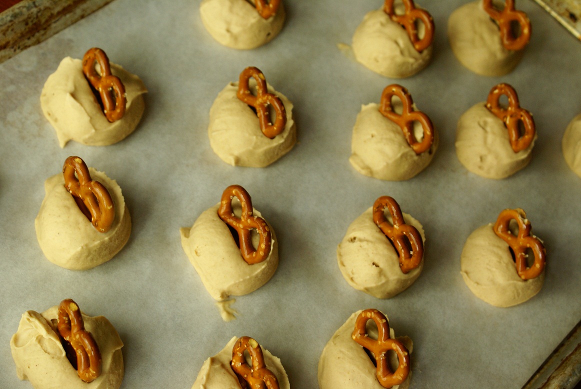 - When finished churning, scoop the ice cream with a 1 1/2 Tbs scoop. Place the scoops on a parchment-lined sheet. Gently press a mini pretzel into the top of each scoop, covering about 1/3 of the pretzel. Put the sheet in the freezer for about 2 hours, or until the scoops are frozen solid. **Freeze an extra parchment-lined baking sheet for later.**