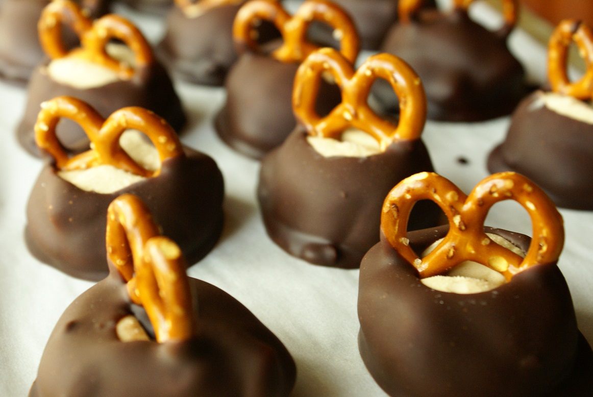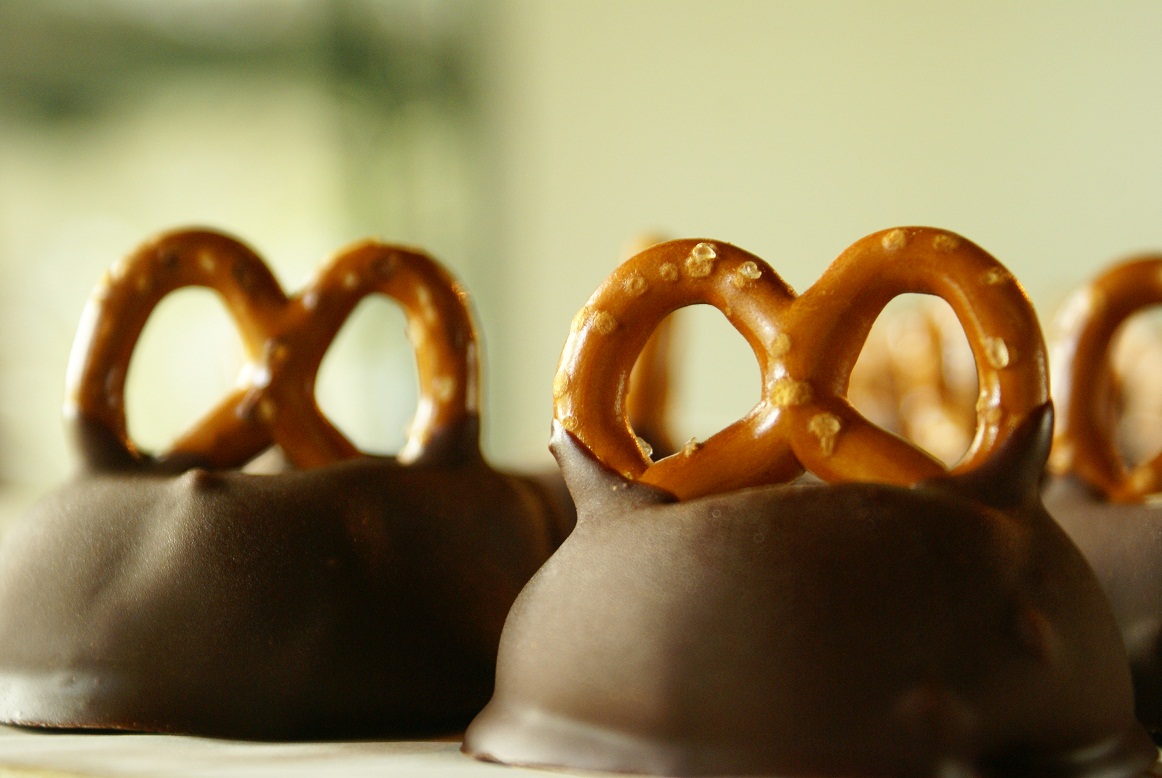 - Set up your work station. From left to right you should have: the sheet of frozen truffles, the bowl of melted chocolate next to that, and the second frozen sheet next to that. Carefully peel the truffles from the parchment, quickly dip in chocolate, and place on the empty parchment lined sheet. **If at any point the ice cream starts to melt, or the chocolate stops adhering easily to the ice cream, STOP. Put the ice cream back in the freezer, put the chocolate back over the saucepan. Wait until the ice cream is cold and the chocolate is hot, and start over again.** Freeze the truffles for about 20 minutes, until the chocolate is well set. Peel the truffles carefully from the parchment. If they don’t pull cleanly away, they are not frozen enough. Store in an airtight container in the freezer for up to 2 days. After that the pretzels will lose their crunch.