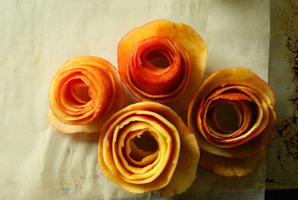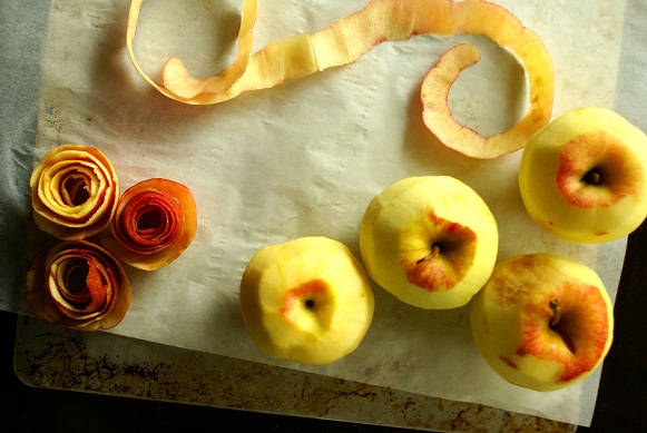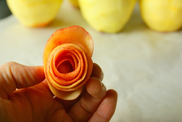 These simple apple peel roses can be brushed with lemon juice (to keep them from browning) and used as a centerpiece at dinner.