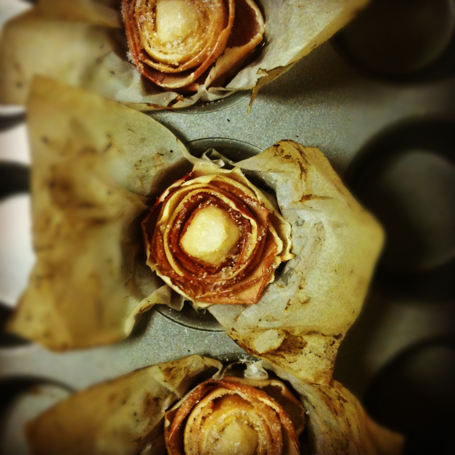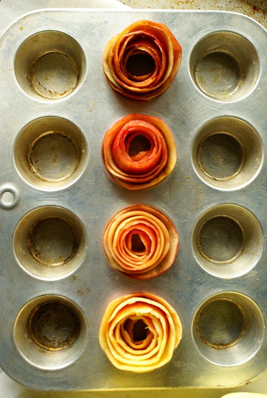 Or, to bake: place a square of parchment paper under each apple in the mini muffin tin (this will make it way easier to lift them out without damaging them). If you want, place a small chunk of apple flesh in the middle of the rose to help fill it out. Brush with melted butter or olive oil. Sprinkle with brown sugar.