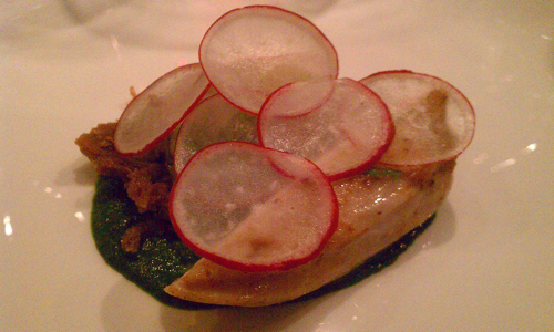 With Poached Hanna Hama Oysters, Radish, Stinging Nettle Sauce, and Lovage Oil