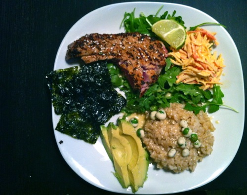 While sushi used to be super exotic, these days it’s pretty easy to find most of the more unique ingredients in mainstream grocery stores. Pickled ginger and wasabi paste are readily available in the Asian section, and even seaweed has become pretty accessible; for example these seaweed snacks by Annie Chun’s even come in non-intimidating packaging and cool flavors (like wasabi—perfect for this salad).